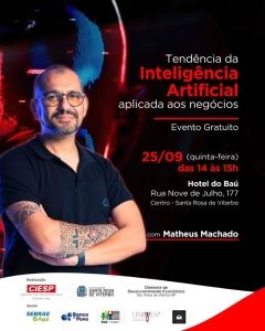 O CIESP – Centro das Indústrias do Estado de São Paulo – Jurisdição São João da Boa Vista e Ribeirão Preto, e a Prefeitura Municipal de Santa Rosa de Viterbo, convidam para a importante palestra com Matheus Viana Machado, fundador da Ascendero – Soluções sem Limites em IA, especialista em transformar desafios em oportunidades através da IA, com vasta experiência em vendas consultivas e gestão estratégica em grandes empresas. Coordenador do Núcleo de Indústria 4.0 do CIESP Ribeirão Preto.