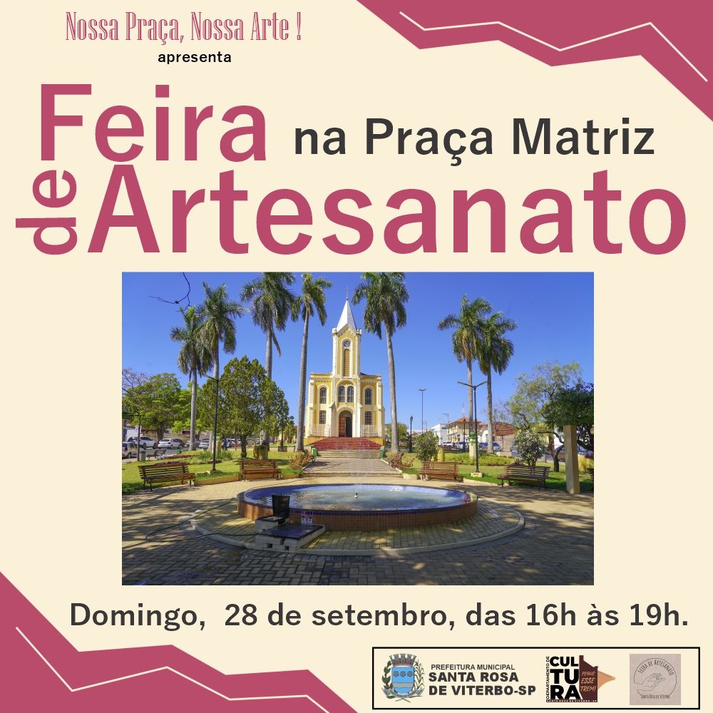 O Departamento de Cultura convida todos a prestigiarem a Feira de Artesanato que será realizada neste domingo, 28 de setembro, das 16h às 19h, na Praça Dr. Guido Maestrello (Praça Matriz), em Santa Rosa de Viterbo.