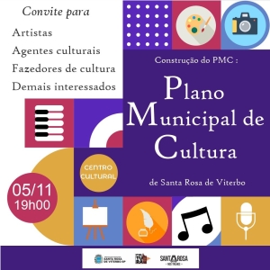 A Prefeitura Municipal de Santa Rosa de Viterbo, por meio do Departamento de Cultura, convida todos os artistas, agentes culturais, fazedores de cultura e demais interessados do município para participarem da reunião de construção do Plano Municipal de Cultura, que acontecerá no dia 05 de novembro de 2025, às 19h, no Centro Cultural.
