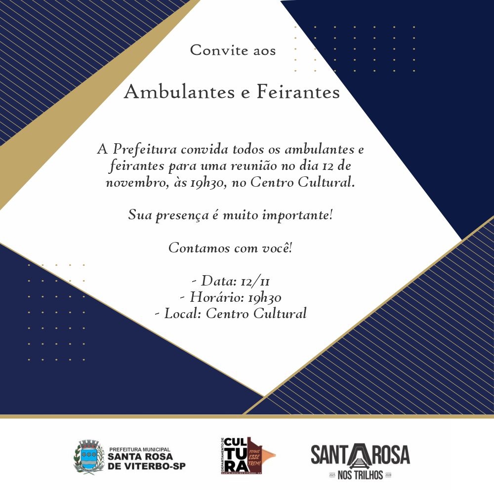 A Prefeitura convida todos os ambulantes e feirantes para uma reunião que será realizada no dia 12 de novembro, às 19h30, no Centro Cultural.