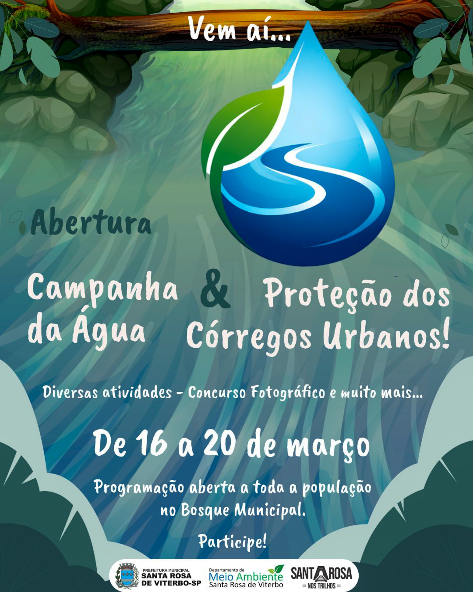 Em comemoração ao Dia Mundial da Água, o Departamento de Meio Ambiente de Santa Rosa de Viterbo promove, de 16 a 20 de março, no Bosque Municipal de Santa Rosa de Viterbo, a Campanha da Água e Proteção dos Córregos Urbanos.