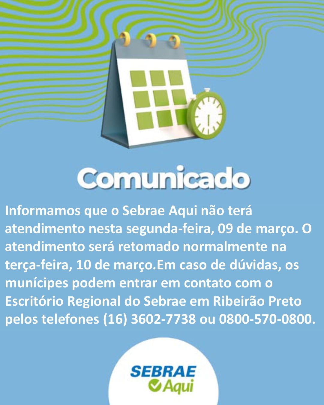 Informamos que o Sebrae Aqui não terá atendimento nesta segunda-feira, 09 de março.