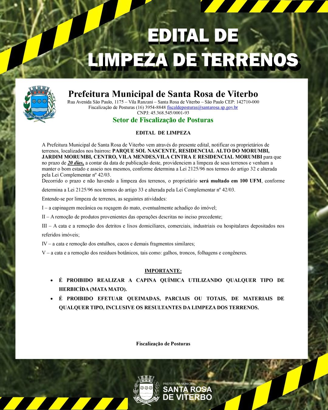 O Setor Municipal de Fiscalização de Posturas notifica os proprietários de terrenos nos bairros Parque Sol Nascente, Residencial Alto do Morumbi, Jardim Morumbi, Centro, Vila Mendes, Vila Cintra e Residencial Morumbi para que, em até 20 dias a partir da publicação deste edital, realizem a limpeza dos seus terrenos, conforme a Lei 2125/96 e suas alterações.