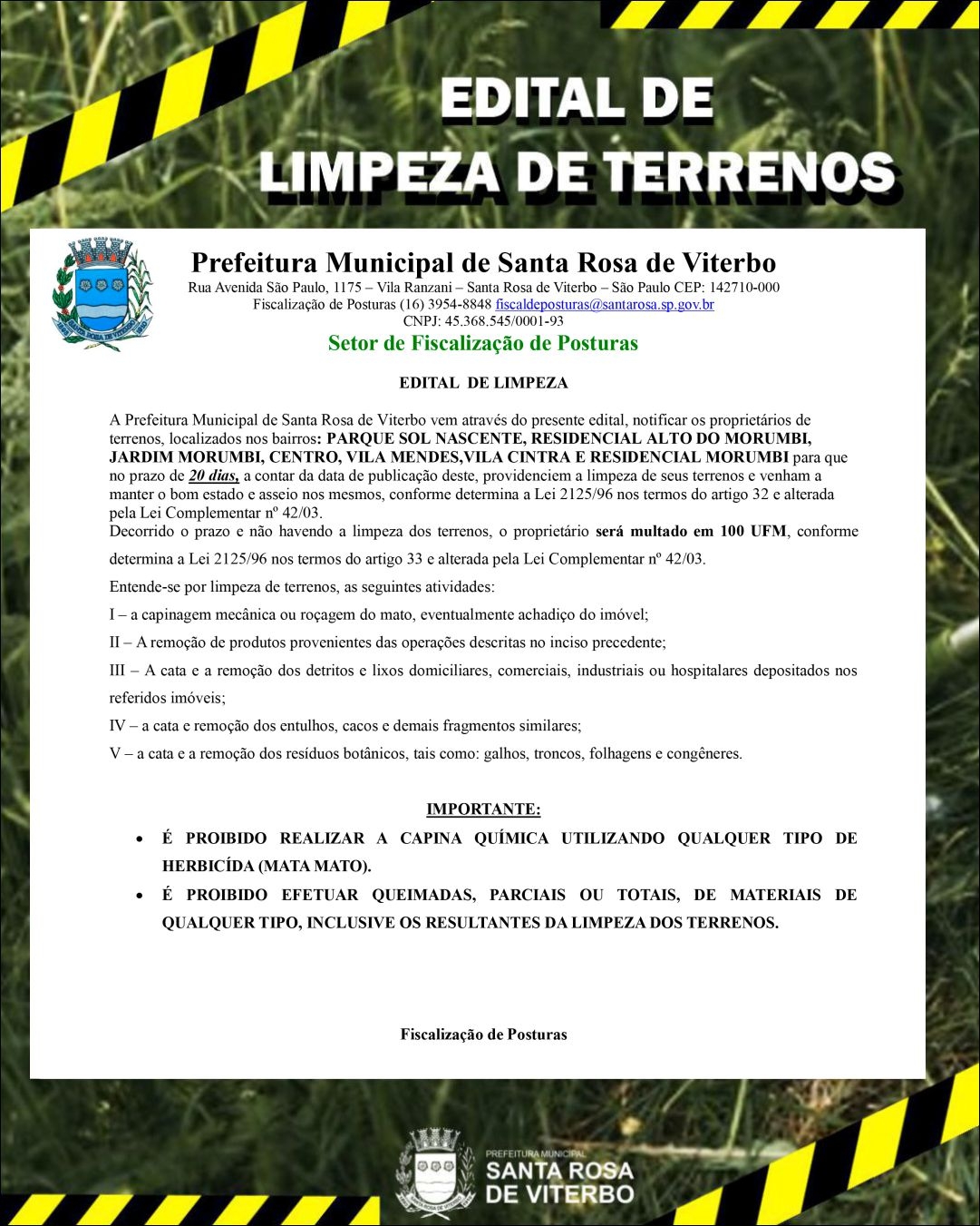 O Setor de Fiscalização de Posturas publicou edital notificando os proprietários de terrenos localizados nos bairros Parque Sol Nascente, Residencial Alto do Morumbi, Jardim Morumbi, Centro, Vila Mendes, Vila Cintra e Residencial Morumbi para que realizem a limpeza dos imóveis, no prazo de 20 dias, conforme a legislação vigente.