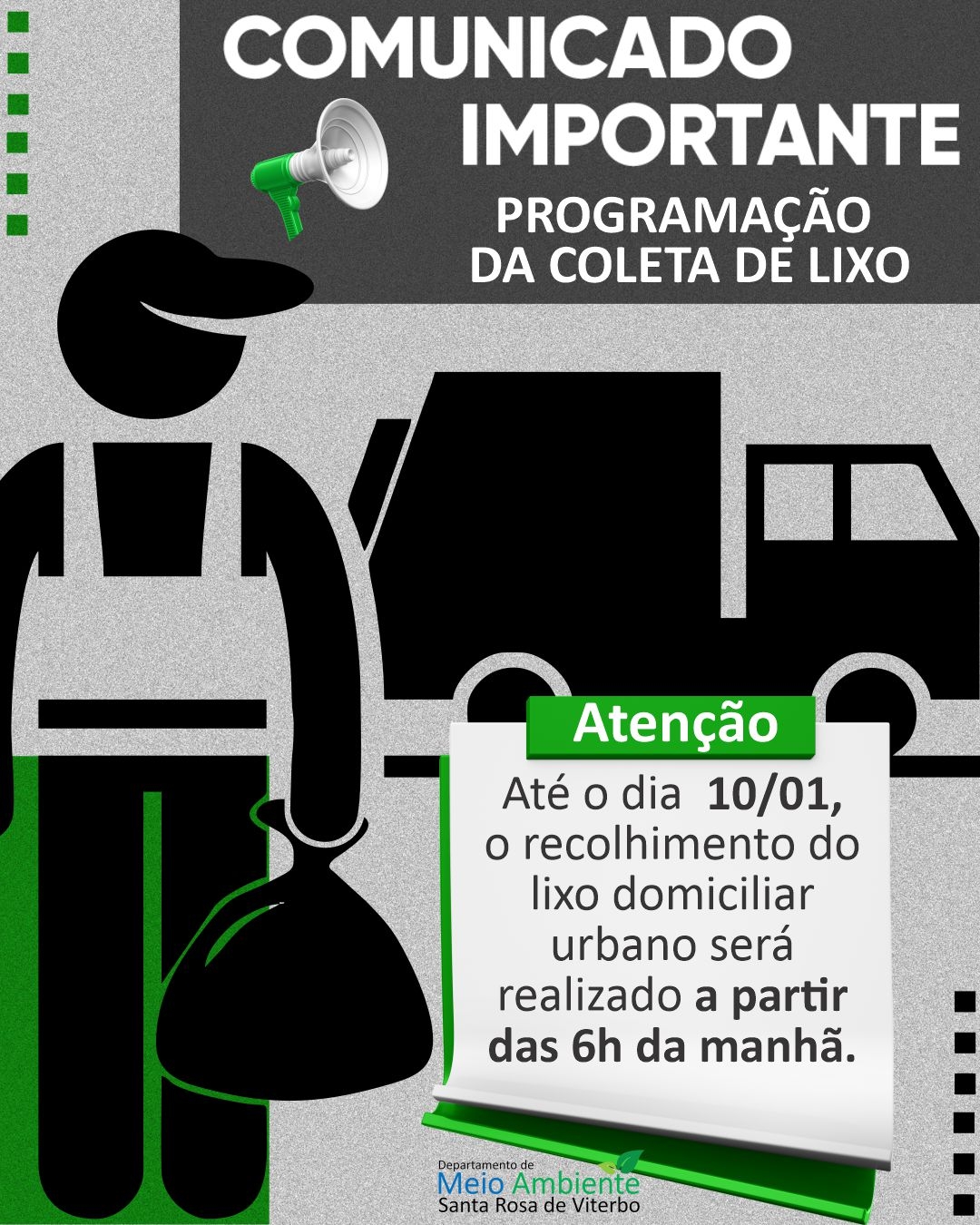 O Departamento de Meio Ambiente informa que, nesta semana, a coleta do lixo domiciliar urbano continuará sendo realizada a partir das 6h da manhã.