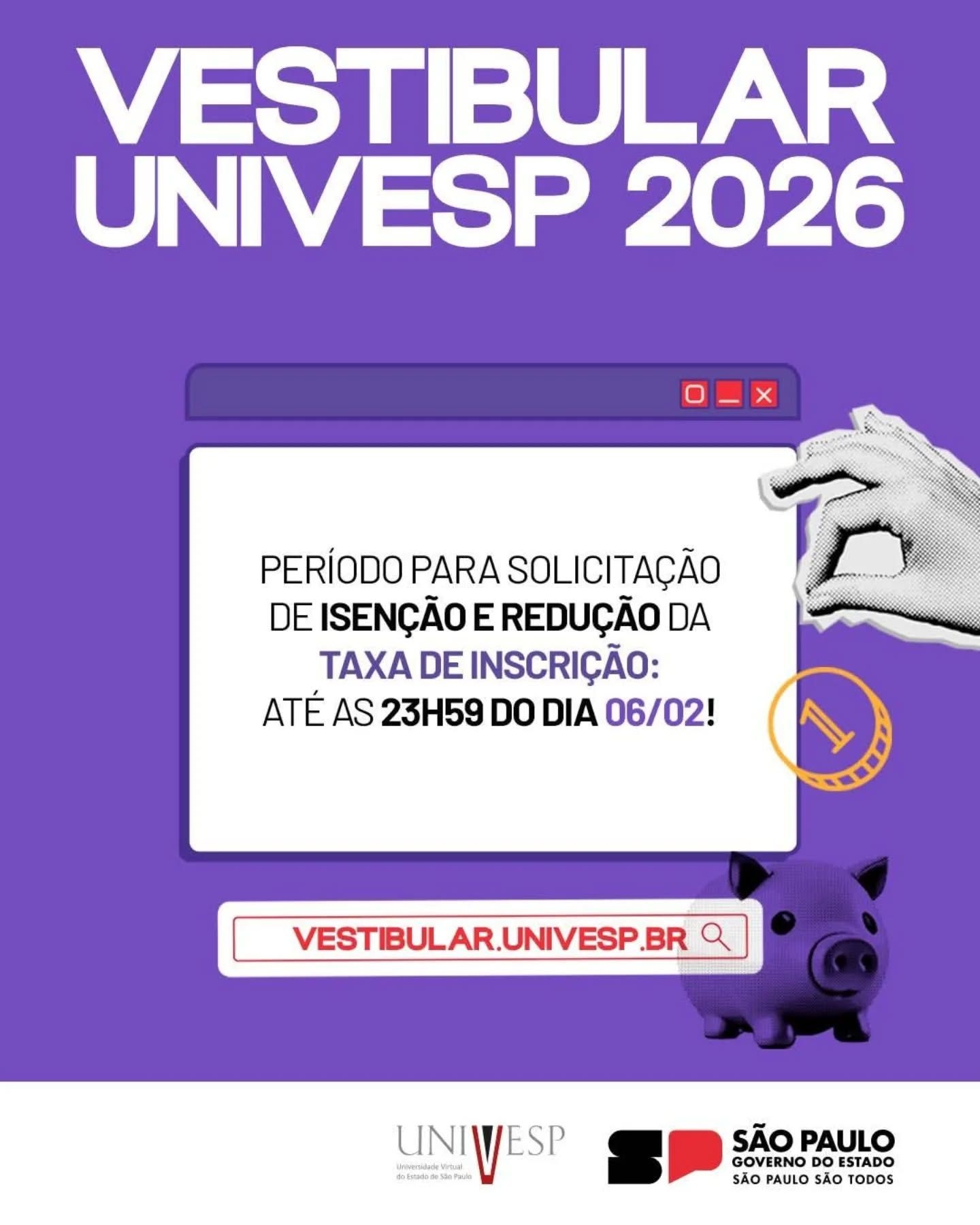 Os pedidos de isenção e redução da taxa de inscrição devem ser feitos no site https://www.vunesp.com.br/UVSP2501 até as 23h59 do dia 06/02!