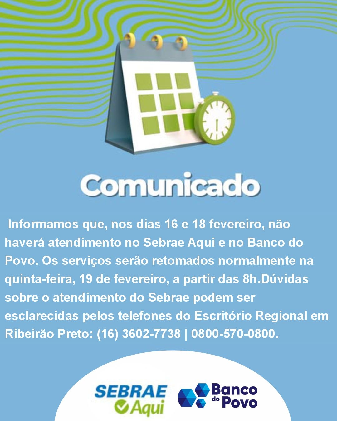 Informamos que, nos dias 16 e 18 fevereiro, não haverá atendimento no Sebrae Aqui e no Banco do Povo. Os serviços serão retomados normalmente na quinta-feira, 19 de fevereiro, a partir das 8h. Dúvidas sobre o atendimento do Sebrae podem ser esclarecidas pelos telefones do Escritório Regional em Ribeirão Preto: (16) 3602-7738 | 0800-570-0800.