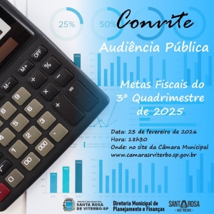 A Prefeitura Municipal de Santa Rosa de Viterbo realiza hoje (23/02), às 18h30, de forma virtual, a Audiência Pública de Avaliação das Metas Fiscais do 3º Quadrimestre de 2025.