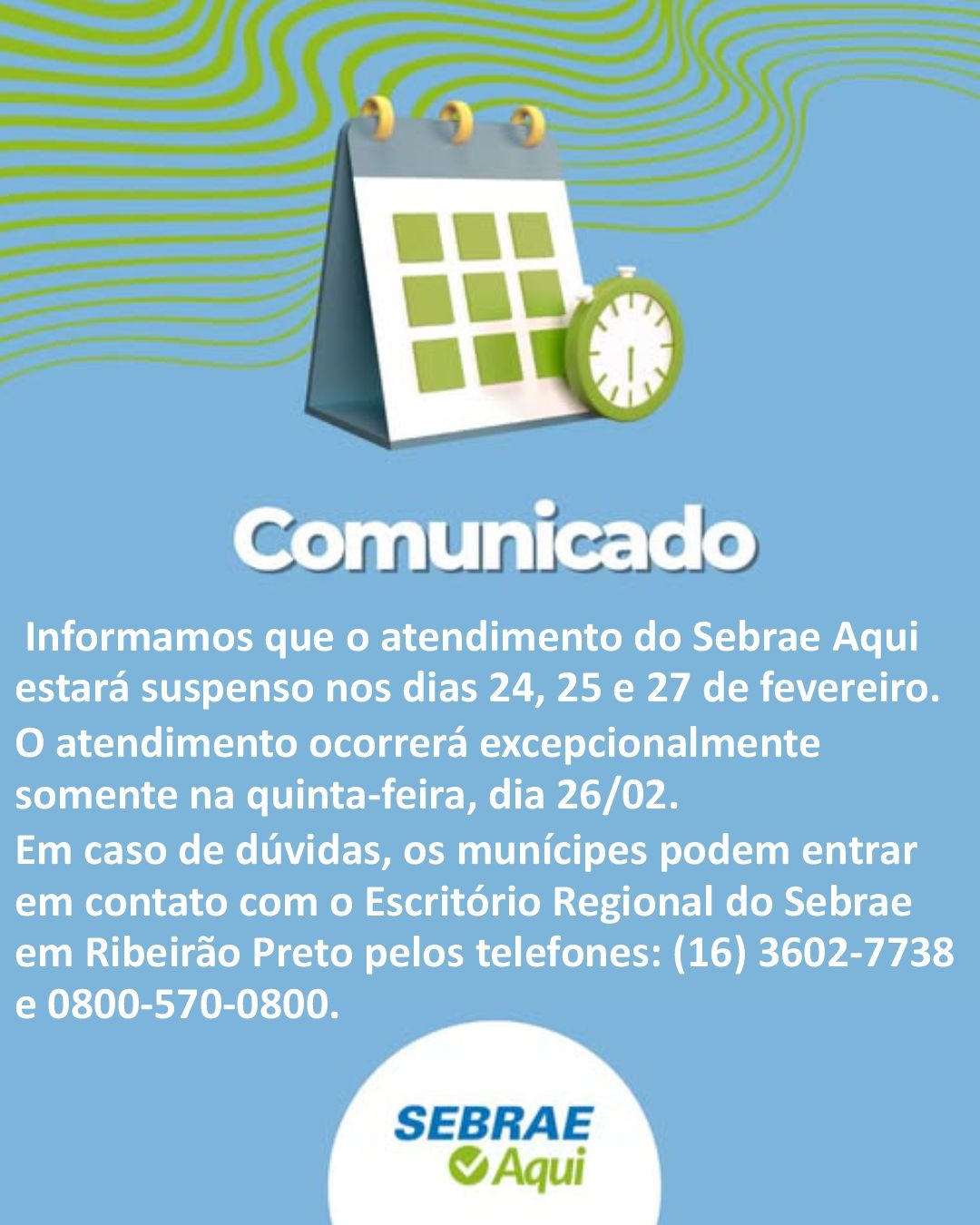 Informamos que o atendimento do Sebrae Aqui estará suspenso nos dias 24, 25 e 27 de fevereiro.