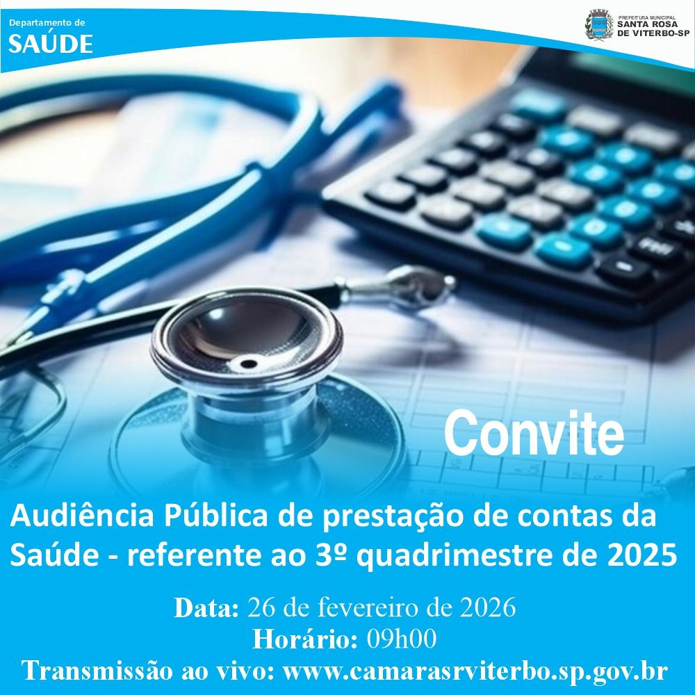 O Departamento Municipal de Saúde convida toda a população para a Audiência Pública de Prestação de Contas referente ao 3º quadrimestre de 2025, conforme determina a Lei Complementar nº 141/2012.