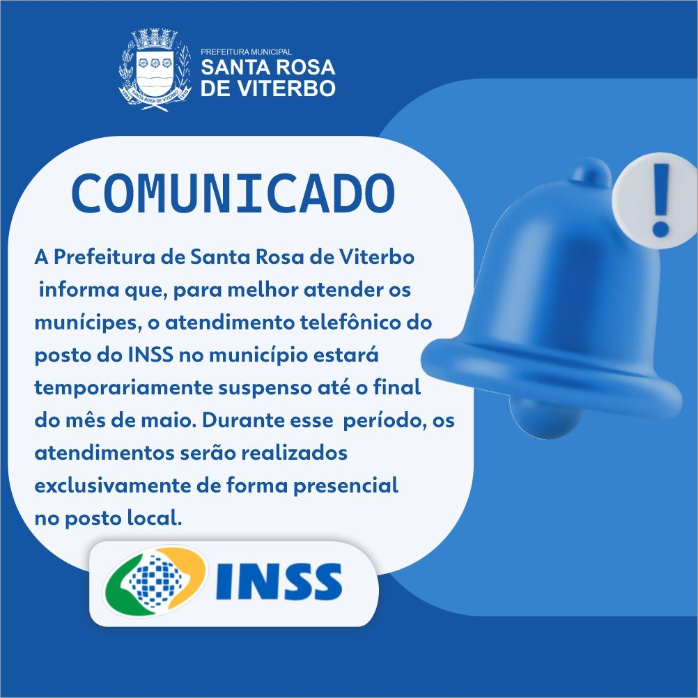 A Prefeitura de Santa Rosa de Viterbo informa que, para melhor atender os munícipes, o atendimento telefônico do posto do INSS no município estará temporariamente suspenso até o final do mês de maio. Durante esse período, os atendimentos serão realizados exclusivamente de forma presencial no posto local.