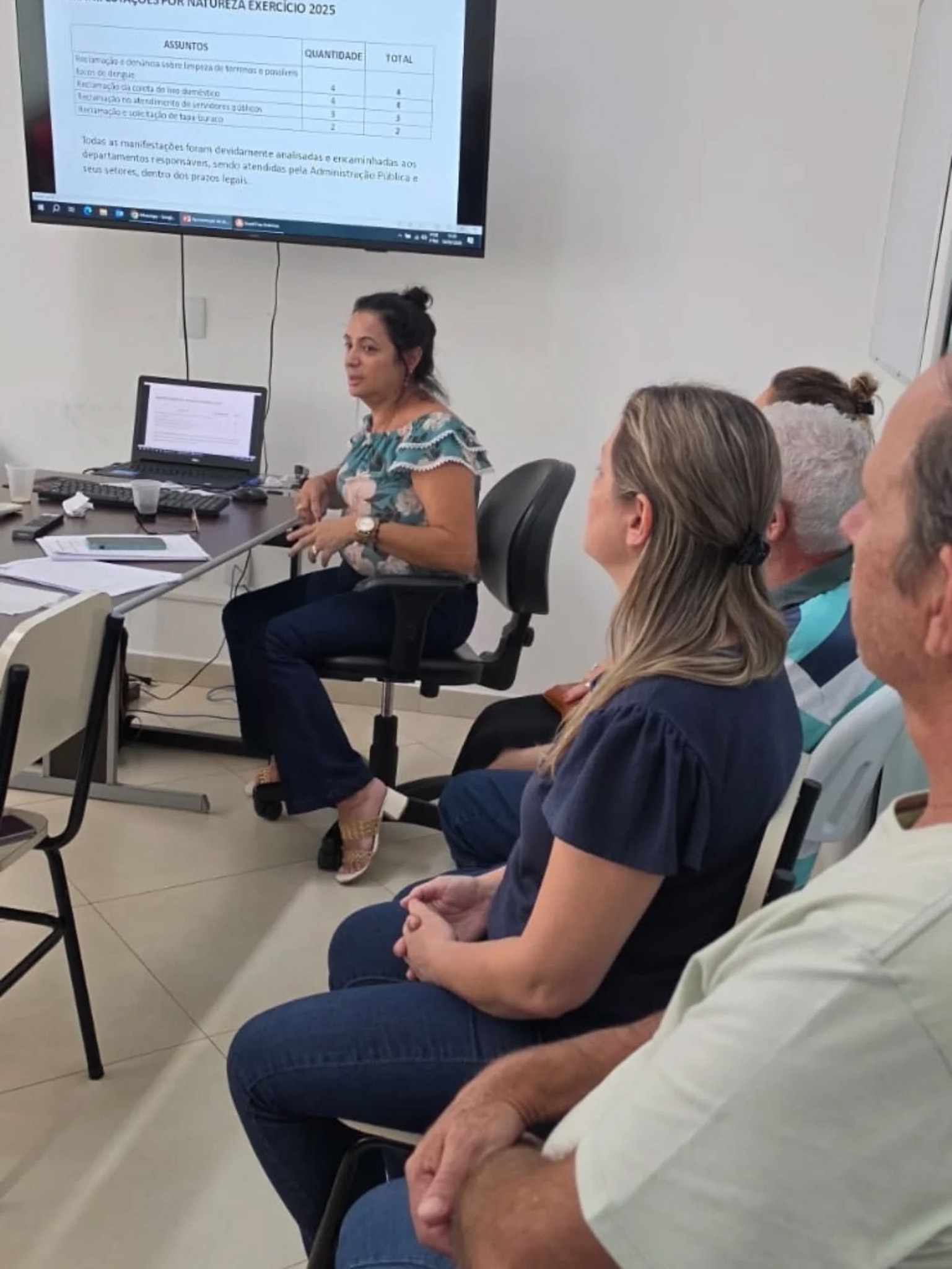 Também foi apresentado o relatório da ouvidoria de 2025, com 59 manifestações, majoritariamente reclamações (64%), seguidas por solicitações (20%). As principais demandas concentraram-se nos setores de engenharia e serviços municipais, saúde e meio ambiente, com destaque para problemas como limpeza de terrenos, dengue, coleta de lixo, atendimento ao público e manutenção de vias.