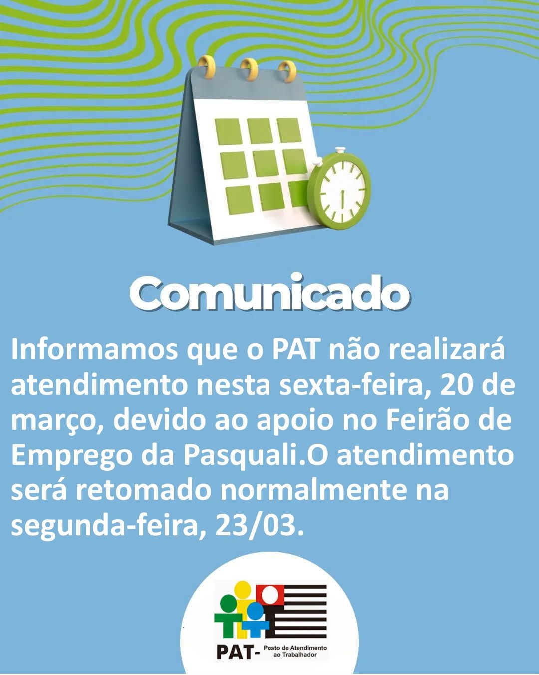 Informamos que o PAT não realizará atendimento nesta sexta-feira, 20 de março, devido ao apoio no Feirão de Emprego da Pasquali. O atendimento será retomado normalmente na segunda-feira, 23/03.