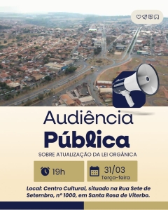 A Câmara Municipal de Santa Rosa de Viterbo convida toda a população para participar de uma Audiência Pública que discutirá a proposta de revisão e atualização da Lei Orgânica do Município (LOM). O encontro será realizado no dia 31 de março de 2026 (terça-feira), às 19h, no Centro Cultural, situado na Rua Sete de Setembro, nº 1000, em Santa Rosa de Viterbo.
