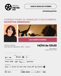 O programa Pontos MIS, em parceria com a Prefeitura Municipal, por meio do Departamento de Cultura e da Fundação Cultural, promove no dia 14 de abril, às 12h30, a oficina “Fazendo filmes de animação com sombras – Silhuetas animadas”, com Marta Russo.