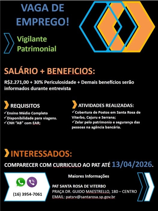 Vaga de emprego em aberto no PAT de Santa Rosa de Viterbo