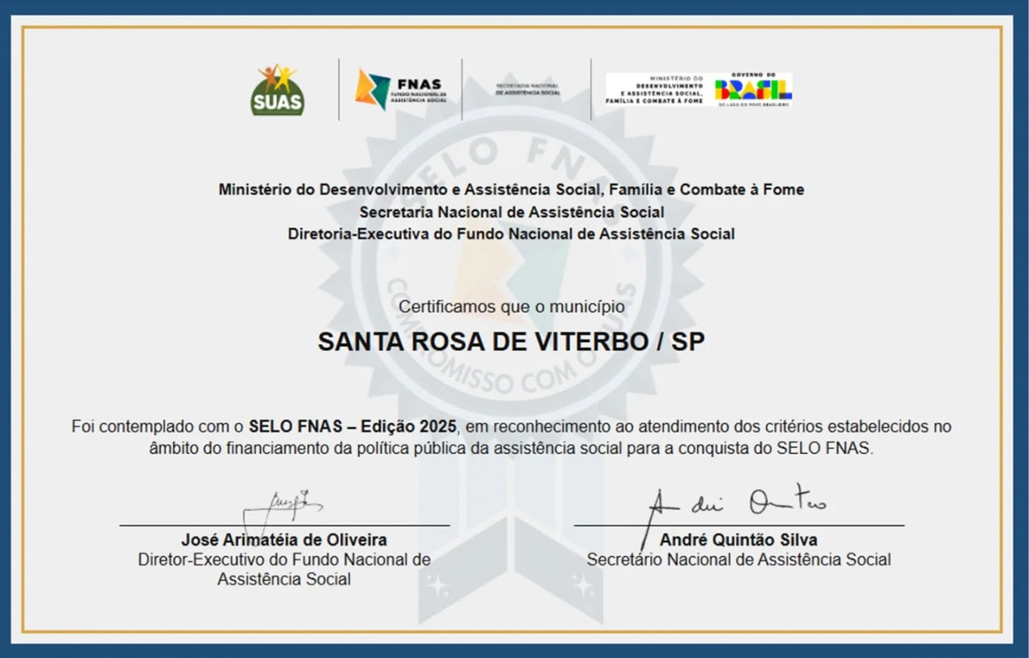 Santa Rosa de Viterbo conquista SELO FNAS 2025 por excelência na gestão da assistência social