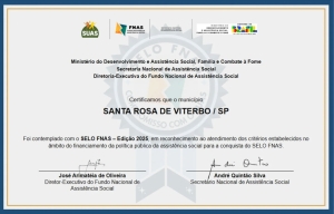 A Prefeitura de Santa Rosa de Viterbo, através do Departamento de Desenvolvimento Social, foi contemplada com o Selo FNAS – Edição 2025, concedido pelo Fundo Nacional de Assistência Social, órgão vinculado ao Ministério do Desenvolvimento e Assistência Social, Família e Combate à Fome. A certificação reconhece o atendimento, por parte do município, aos critérios estabelecidos no âmbito do financiamento da política pública de assistência social.