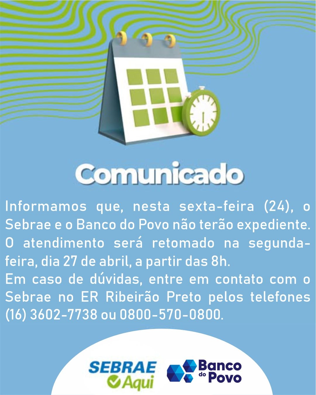 Informamos que, nesta sexta-feira (24), o Sebrae e o Banco do Povo não terão expediente. O atendimento será retomado na segunda-feira, dia 27 de abril, a partir das 8h.